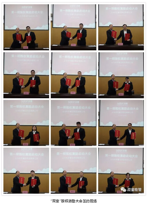 經(jīng)過(guò)八年的探索,經(jīng)過(guò)泰山管理學(xué)院對(duì)“雙童”股權(quán)激勵(lì)工作的支持和指導(dǎo),2018年12月19日,雙童吸管第一期股權(quán)激勵(lì)啟動(dòng)大會(huì)隆重舉行!“雙童”首批12位核心員工真正成為企業(yè)合伙人!