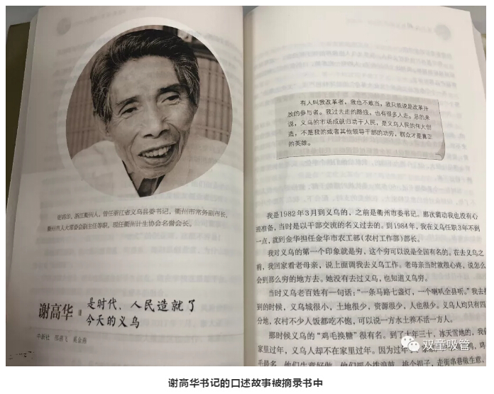 此書記錄了浙江大地最具代表性的40位浙江改革開放見證者,以口述歷史的方式記錄當(dāng)事人所見、所聞、所思與所為!其中,“雙童”樓仲平與原義烏縣縣委書記謝高華是代表義烏改革開放40年發(fā)展的標(biāo)志性人物!