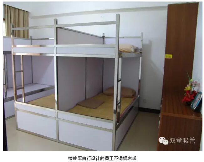 “雙童”員工集體寢室的不銹鋼床架可是參觀團(tuán)隊(duì)最津津樂(lè)道的話題之一!這些床架都是由“雙童”樓仲平自行設(shè)計(jì),在建造之初就把床架焊在地上。這樣一來(lái),即避免產(chǎn)生垃圾死角,床下又多了一個(gè)封閉的儲(chǔ)物空間,確保員工在生活方面的便利舒適!