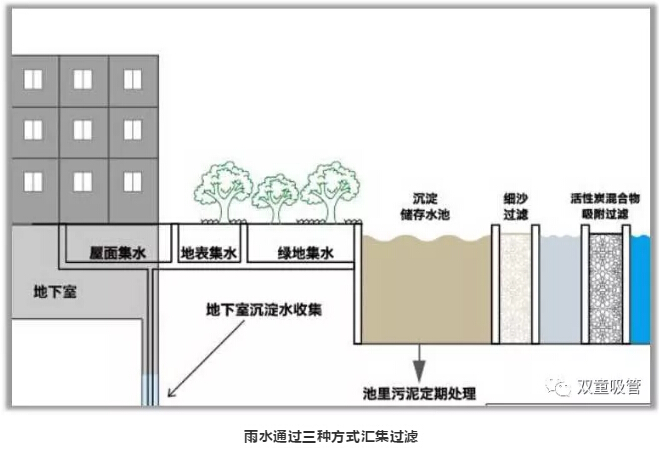 如此實用的系統(tǒng)是如何形成的呢?秘訣就是在屋頂、路面、綠化帶中做好雨水收集點,用地下管道把它們連成一個整體,經(jīng)過科學(xué)過濾,匯集到一個占地700多平方米、總裝水容量近4000噸的雨水收集池。
