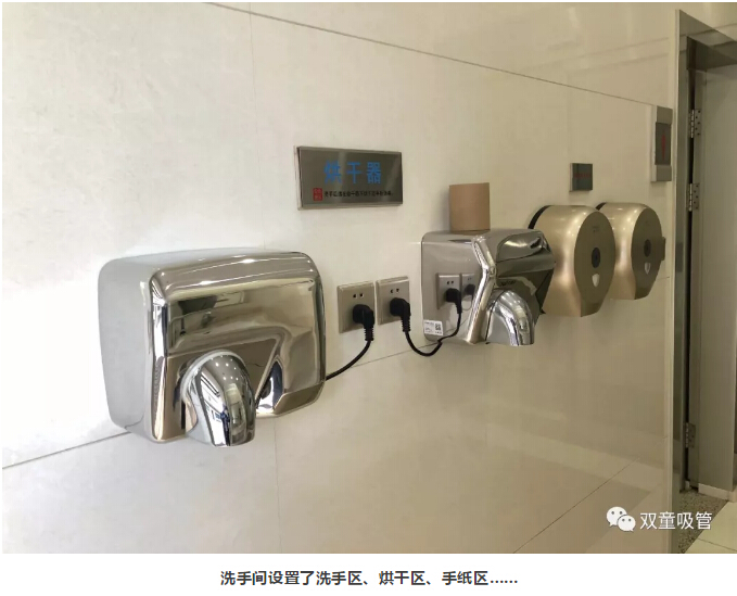 “雙童”每個(gè)洗手間的格局分明,除了男女衛(wèi)生間外,還設(shè)置了殘疾人洗手間。洗手區(qū)、烘干區(qū)、手紙區(qū),各個(gè)區(qū)域的配置十分齊全。進(jìn)入衛(wèi)生間前,員工可以在手紙區(qū)取紙巾。洗手后,還可以用烘干機(jī)把手烘干。