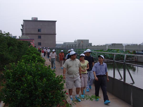 上圖為公司張國?。ㄓ乙唬└笨偨?jīng)理向企業(yè)代表團(tuán)介紹循環(huán)經(jīng)濟(jì)屋頂綠化節(jié)能降耗情況