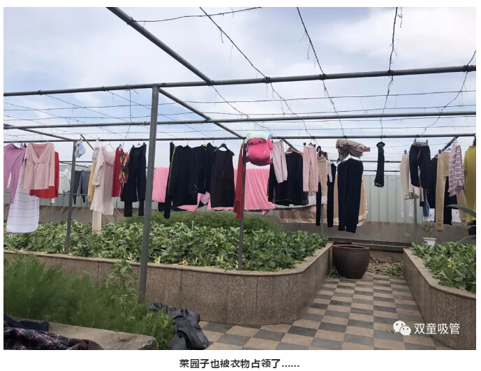 瞧!“雙童”人捂了一個月的衣物、被子曬滿了晾衣平臺!就連平時空著的屋頂菜園都被占領(lǐng)的滿滿當(dāng)當(dāng)?shù)模途G油油的蔬菜交相輝映……