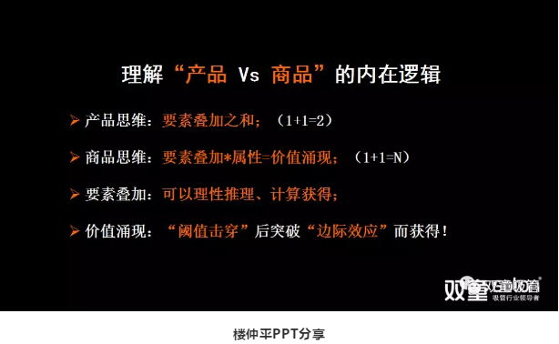 接著,樓仲平引導(dǎo)大家思考“產(chǎn)品 VS 商品”的關(guān)系,在這個(gè)模型中,產(chǎn)品本身(一根吸管)只是組成“商品”的基礎(chǔ)核心,是最基本的要素疊加之和,1+1=2。