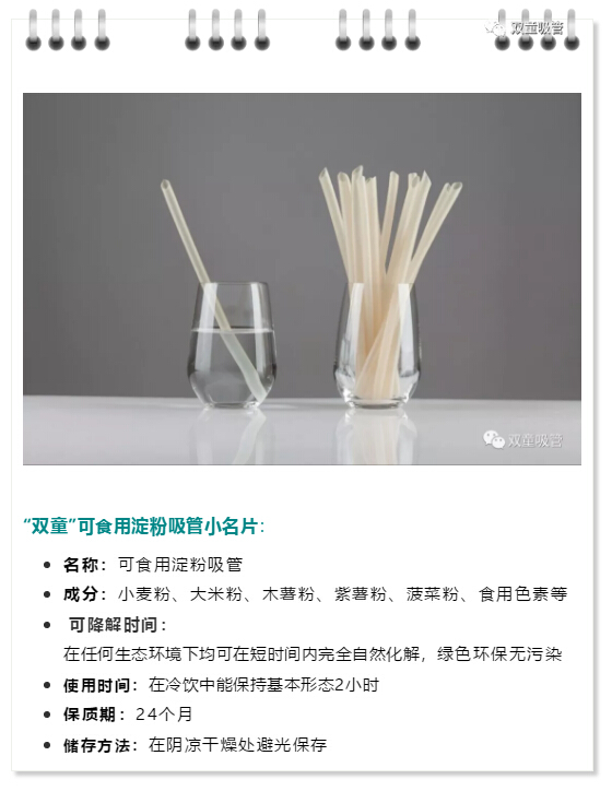比如:把最容易丟棄和不能回收利用的塑料吸管改成“雙童”可食用淀粉吸管!