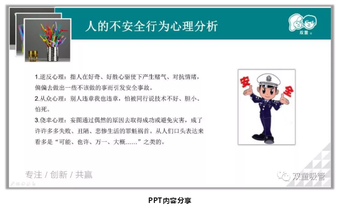 緊接著,李講師也分析了人的不安全行為心理,違章的人一般都有著逆反心理、從眾心理、僥幸心理、冒險心理…… 他們在實際操作中始終抱著僥幸心理,錯誤地認為違章不一定出事,出事不一定傷人,傷人不一定傷己,傷己不一定死人,從而導(dǎo)致各類安全事故的發(fā)生!李講師也警醒同學(xué)們:在工作和生活當中千萬不要抱有這幾種心態(tài),避免安全隱患的發(fā)生!