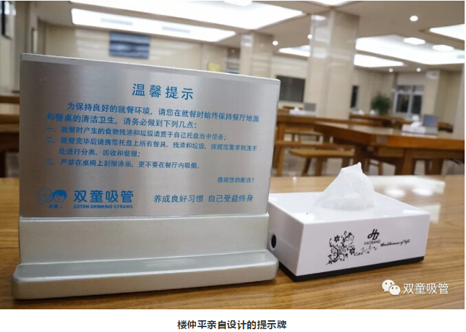 食堂餐桌上,擺放著樓仲平親自設(shè)計(jì)的提示牌,標(biāo)注的文字并不“可愛”:用餐者把食物殘?jiān)胖迷谕斜P中;用餐完畢后,在洗手處把碗具和餐后垃圾分類投放;嚴(yán)禁在桌椅上涂鴉。