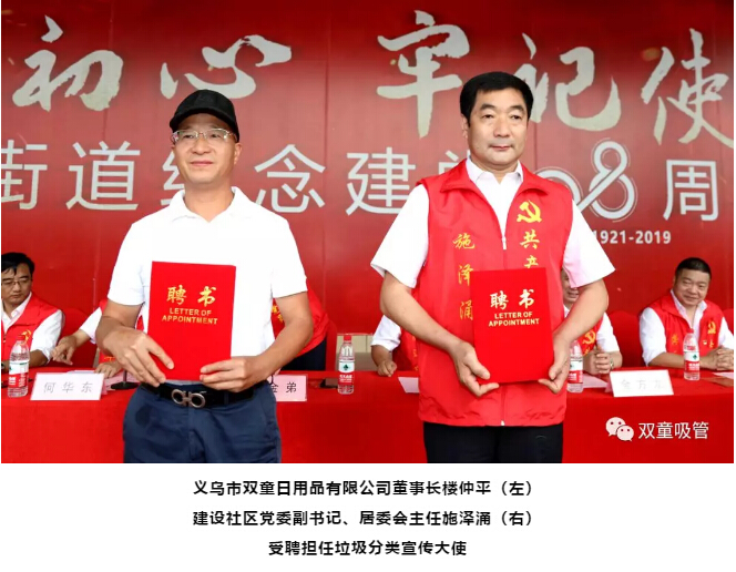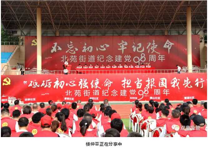 這不,6月29日上午,北苑街道為紀(jì)念中國(guó)共產(chǎn)黨成立98周年,開展了建黨98周年慶“七一”專題千人大黨課?!半p童”樓仲平也受邀參加了此次活動(dòng),并受聘擔(dān)任了垃圾分類宣傳大使!