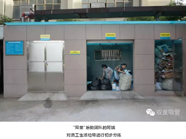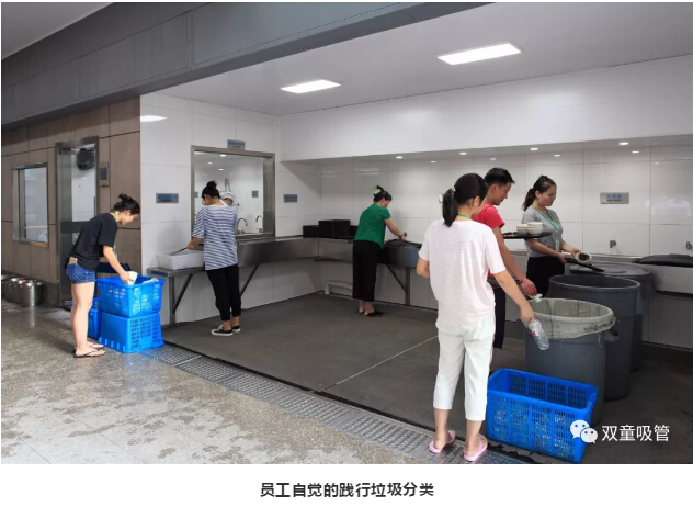 4.“雙童”大部分濕垃圾(餐廚垃圾)在餐廳的源頭給予分類,通過教育培訓(xùn)并在每張餐桌上都擺放著垃圾分類的標(biāo)語(yǔ)提示牌,提醒員工們就餐后及時(shí)按食物垃圾、衛(wèi)生紙、包裝物三種類別分類投放于洗碗出三個(gè)大桶中,其中的包裝物和紙張垃圾作為資源類垃圾回收、食物垃圾供應(yīng)給養(yǎng)殖戶作飼料回收,從而把企業(yè)所有的濕垃圾全部消滅;