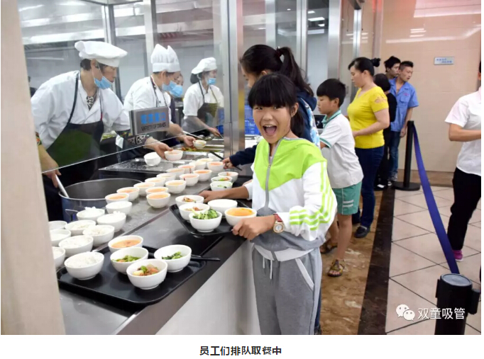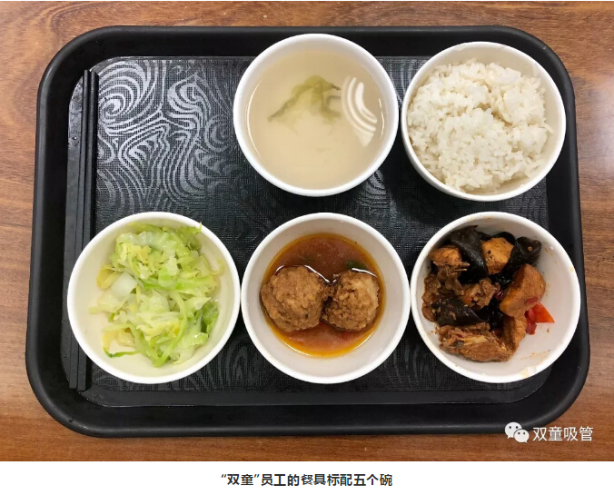 每天中午11點(diǎn),是“雙童”員工午餐時(shí)間。員工餐廳布局并不顯眼,但環(huán)境整潔、員工用餐井然有序。每位員工取過一個(gè)托盤,從窗口依次拿好五個(gè)碗,包含三菜一湯一飯。