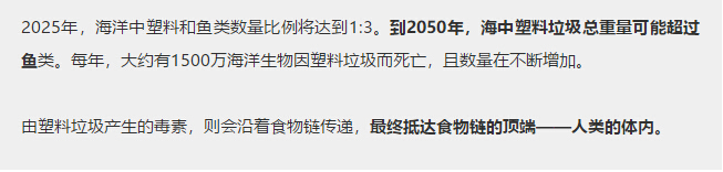 由塑料垃圾產(chǎn)生的毒素,則會(huì)沿著食物鏈傳遞,最終抵達(dá)食物鏈的頂端——人類(lèi)的體內(nèi)。