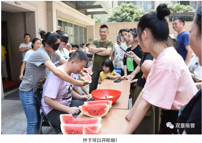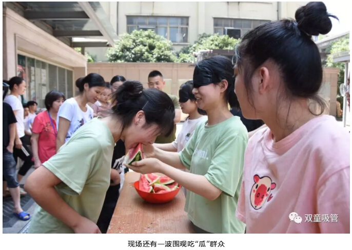 兩人一組,一個(gè)蒙眼喂西瓜,一個(gè)吃西瓜,聽起來十分簡單,但也看雙方的配合是否默契?,F(xiàn)場相互比拼的緊張氣氛,看得所有人都倒吸一口氣!不過,這位童鞋可真賣力!