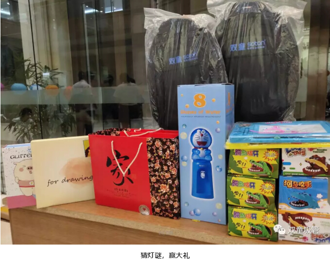 活動(dòng)正式開始!員工們早就躍躍欲試?yán)?!大家紛紛來到燈籠旁仔細(xì)閱讀燈籠下掛著的燈謎,得出答案后到領(lǐng)獎(jiǎng)區(qū)校對答案,猜對燈謎的員工們即可獲得抽獎(jiǎng)機(jī)會(huì)一次,禮盒月餅、“雙童”定制背包、桌面飲水機(jī)……各類禮品也讓員工們喜笑顏開!
