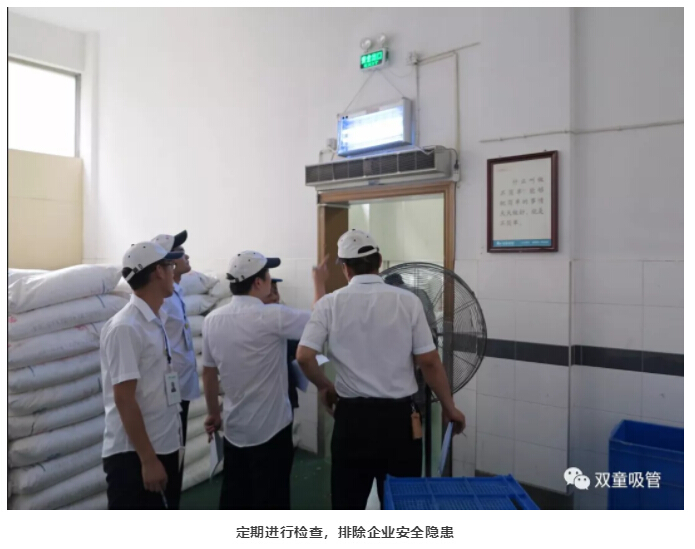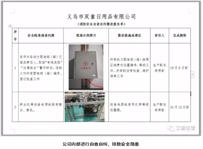 此次重大火災事故發(fā)生后,瞬間引發(fā)了“雙童”強烈危機感,所有“雙童”人深刻意識到安全的重要性!安全工作已經(jīng)迫在眉睫,雖然事故發(fā)生后恰逢國慶員工放假期間,“雙童”安全工作也在緊鑼密鼓的開展,廠區(qū)內(nèi)安排了值班人員,每天開展安全排查等工作,進行自查自糾,并邀請專家到公司做安全指導工作?!半p童”在安全排查期間,共計發(fā)現(xiàn)了39項安全隱患,明確責任人和改進期限,杜絕安全隱患!