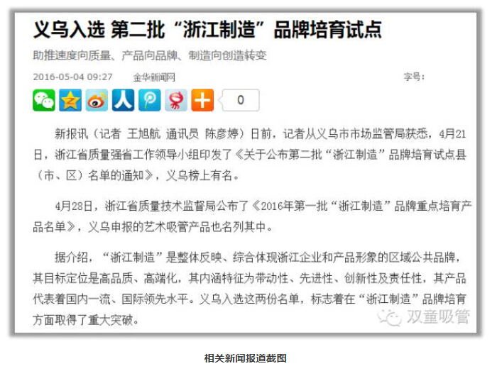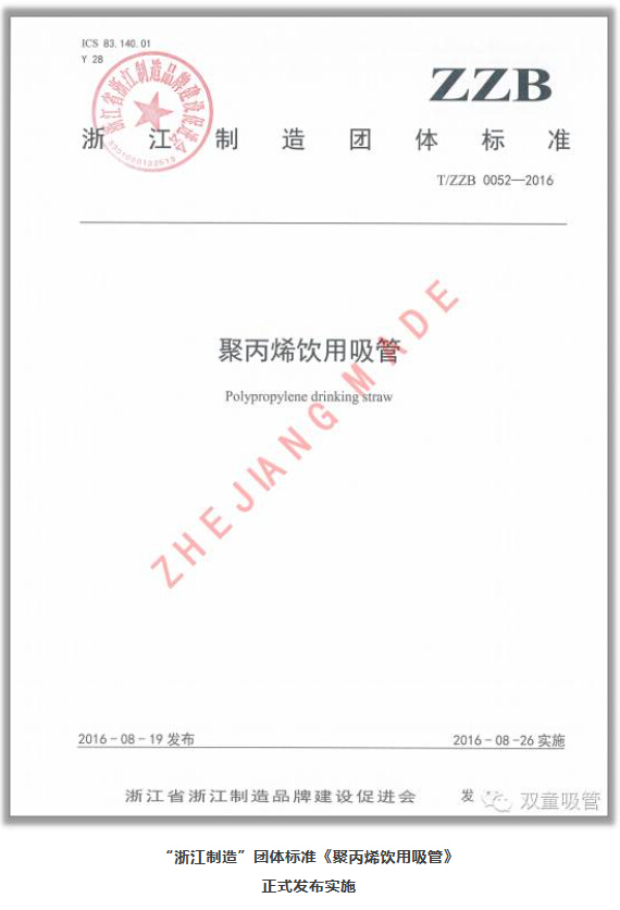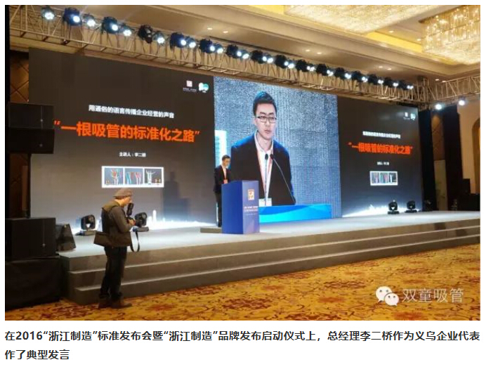 雙童成為義烏首家“浙江制造”標準企業(yè) 首先,讓我們來回顧一下“雙童”成為義烏首家制訂“浙江制造”標準企業(yè)的過程: 2016年年初,經(jīng)浙江省質(zhì)量技術(shù)監(jiān)督局、浙江省標準化研究院等相關(guān)領(lǐng)導(dǎo)專家團隊多次論證,認為“聚丙烯飲用吸管”符合“浙江制造”定位要求,推動聚丙烯飲用吸管品牌認證具有重大意義,決定將“聚丙烯飲用吸管”列入2016年“浙江制造”品牌認證目錄,并由“雙童”主導(dǎo)制訂“浙江制造”《聚丙烯飲用吸管》標準。