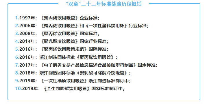正是因?yàn)椤半p童”持續(xù)主導(dǎo)吸管行業(yè)標(biāo)準(zhǔn)的制定,使得“雙童”始終站在行業(yè)的制高點(diǎn),直接推動企業(yè)的品質(zhì)管理體系的建立、改善和提升,直接影響企業(yè)的品牌傳播,并最終獲得吸管產(chǎn)業(yè)的話語權(quán)、規(guī)則權(quán)和定價(jià)權(quán),成為全球吸管行業(yè)的領(lǐng)導(dǎo)者!