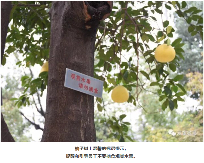 原來,為了“雙童”的生態(tài)和美觀,公司明確柚子是觀賞性水果,每棵柚子樹上都有“觀賞水果,請勿摘食”的字樣,提醒和引導(dǎo)員工不要摘食觀賞水果。
