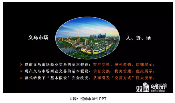 再以義烏市場為例,二十年前,我們理解義烏市場的交易方式是客戶交換、薄利多銷、店鋪展示;但在工業(yè)化范式到互聯(lián)網(wǎng)范式的轉(zhuǎn)換過程中,今天的義烏市場已經(jīng)發(fā)生了逆轉(zhuǎn)。范式轉(zhuǎn)換下,“基本假設(shè)”的完全改變,引發(fā)了“交易方式”的巨大變革!