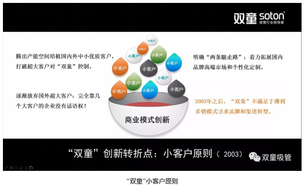 在當(dāng)時(shí)的局勢下,別的企業(yè)都忙著擴(kuò)大生產(chǎn)規(guī)模做加法時(shí),“雙童”卻反其道而行之,做減法,在2003年提出了“兩條腿走路”和“小客戶原則”,在原有規(guī)模下改變商業(yè)模式,寧可盈利不做大,不要做大不盈利。