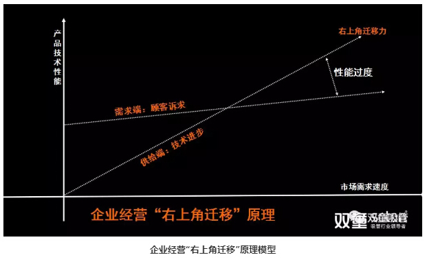 當(dāng)企業(yè)經(jīng)營的“右上角遷移”力高于需求端客戶訴求的“右上角遷移”力時(shí),將會(huì)產(chǎn)生“性能過度”。由此看出,這個(gè)過程當(dāng)中企業(yè)所投入的大量成本,大量技術(shù)研發(fā),大量創(chuàng)新實(shí)際上是造成了巨大浪費(fèi)。
