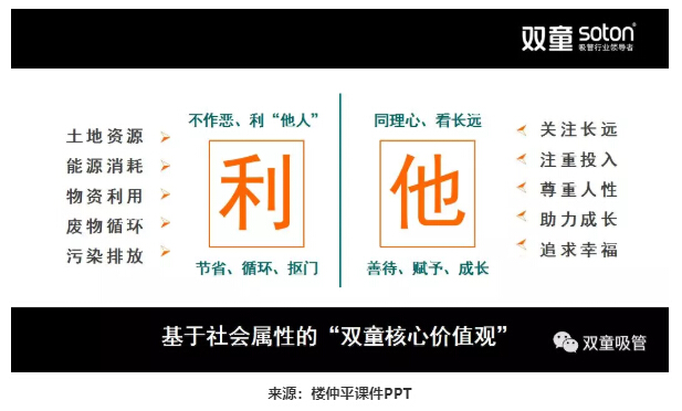 以“雙童”為例:“雙童”樓仲平一直以來深受日本文化的影響,因此,經(jīng)營“雙童”26年的過程中,不斷的轉(zhuǎn)變,不斷的放棄,不愿做一家只能掙錢的大公司,而希望做一家有利于行業(yè)、有利于社會、有利于環(huán)境生態(tài)的好公司。