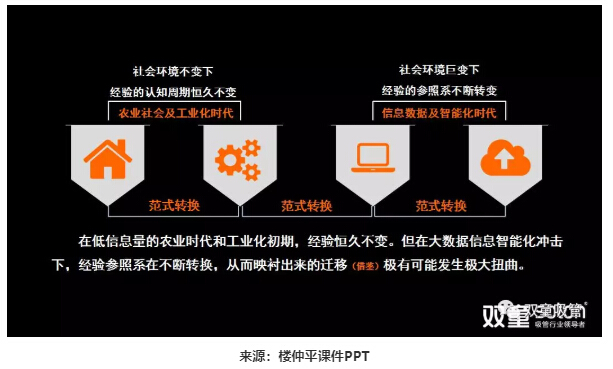 因此,在時代背景的轉(zhuǎn)變下,我們原先認知的經(jīng)驗很有可能就成了絆腳石。下面,樓仲平繼續(xù)引導(dǎo)大家理解這頁PPT: