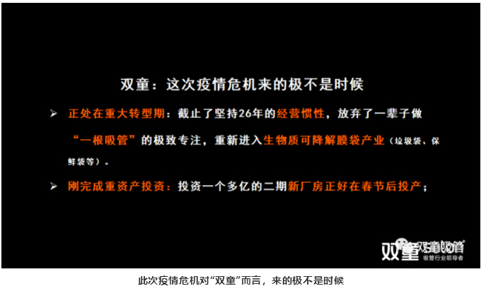 面對此次疫情危機對“雙童”帶來的巨大影響和挑戰(zhàn),“雙童”在堅守實業(yè)的同時選擇擁抱變化,突破固有思維,不再僅僅只做一根吸管,堅持發(fā)展企業(yè)“第二曲線”轉(zhuǎn)型投產(chǎn)于生物質(zhì)可降解膜袋!