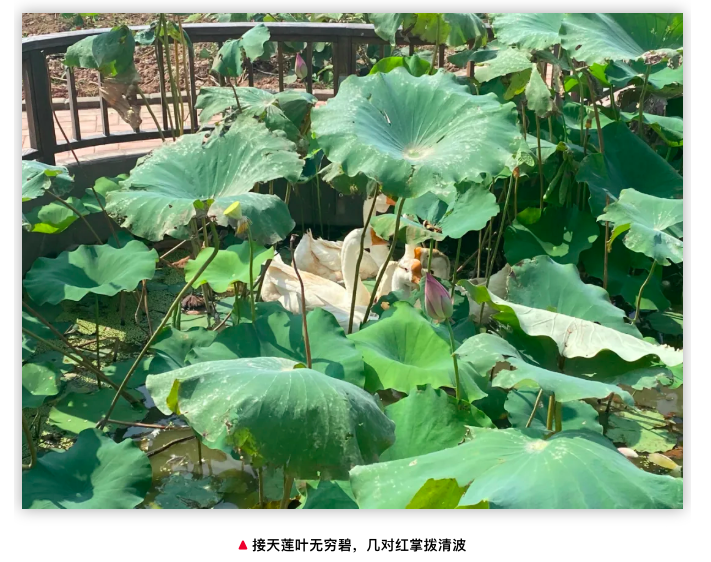 100多平米的“空中藕塘”里,有荷花迎風(fēng)招展,蓮蓬低垂悄立,翠綠的荷葉撐起爿爿蔭蔽,小魚和大鵝們悠游其間。