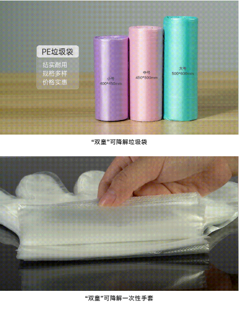 為配合國家產業(yè)政策向生物質可降解材料方向轉變,“雙童”也重磅推出了可降解膜袋、可降解購物袋等膜袋類產品。