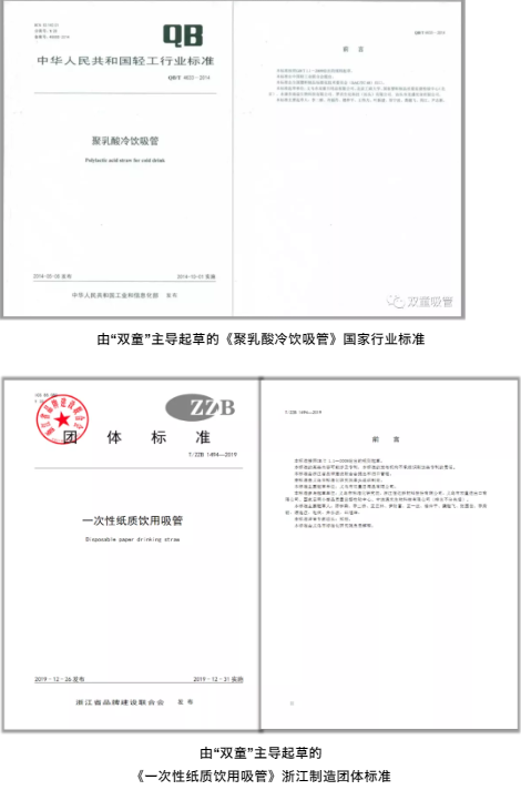 而且,從標準方面而言,“雙童”不僅主導制定了聚丙烯吸管行業(yè)的行業(yè)標準、國家標準和國際標準,還在2014年就主導起草了《聚乳酸冷飲吸管》國家行業(yè)標準,2019年主導起草了《一次性紙質飲用吸管》浙江制造團體標準,緊握住了吸管行業(yè)的規(guī)則制定權和行業(yè)話語權!