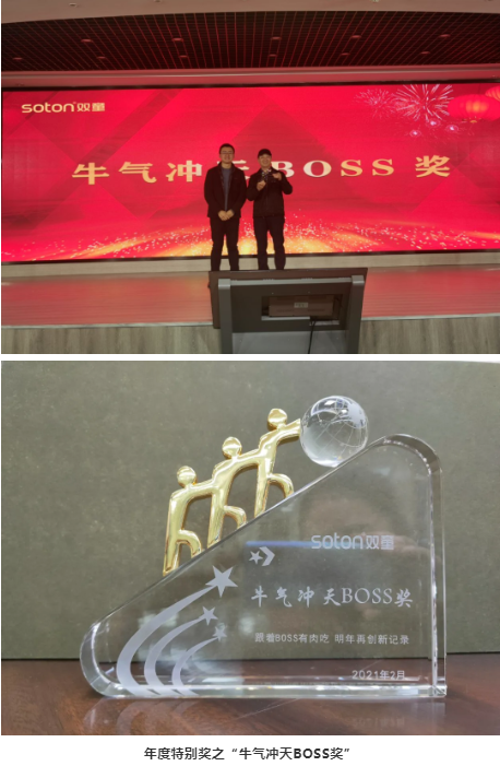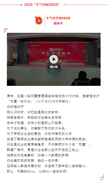 2020年是疫情突發(fā)年,我們的產(chǎn)值也受到了前所未有的挑戰(zhàn),國(guó)外貿(mào)易大幅下降,幸而國(guó)內(nèi)貿(mào)易在今年異軍突起。在此,我對(duì)“雙童”所有員工表示感謝。馬上2021年迎面向我們走來(lái),而2021年又是充滿機(jī)會(huì)和挑戰(zhàn)的一年,我們面前只有一條路:做好自己、迎接挑戰(zhàn)、創(chuàng)造未來(lái)!除了給優(yōu)秀奮斗者頒發(fā)了獎(jiǎng)項(xiàng)之外,“雙童”全體員工還為我們的Boss——樓仲平準(zhǔn)備了一個(gè)驚喜!到底是什么驚喜呢?戳視頻一起來(lái)看看:最后,總經(jīng)理李二橋現(xiàn)場(chǎng)為樓總頒發(fā)了“牛氣沖天BOSS獎(jiǎng)”!愿公司在兩位Boss的帶領(lǐng)下,“雙童”在2021年度能夠能蒸蒸日上,越來(lái)越好!