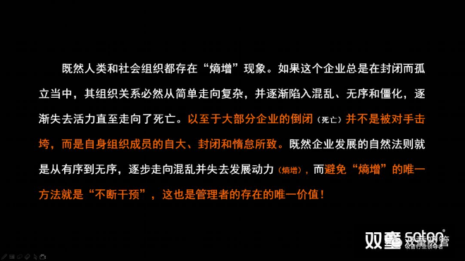 “熵”,是來自于物理學(xué)熱力學(xué)第二定律的一個詞。“熵增定律”意指在任何“孤立而封閉”系統(tǒng)中,其系統(tǒng)無序度必然增加,最終會達(dá)到“熵”的最大值“死寂”。簡單理解就是:任何一個人,任何一個組織,乃至于任何一個家庭,如果你把自己封閉起來,你的內(nèi)部一定是從有序到無序。如果你繼續(xù)封閉,它的混亂程度一定會達(dá)到最大值,一直到死寂。“雙童”樓仲平也曾多次在課程分享中引用熱力學(xué)第二定律的“熵增定律”,把“雙童”存在的問題通過自然的現(xiàn)象加以挖掘、頗析、呈現(xiàn)、對照,從而來尋求問題解決的方法。樓仲平分享的“熵增定律”PPT頁面