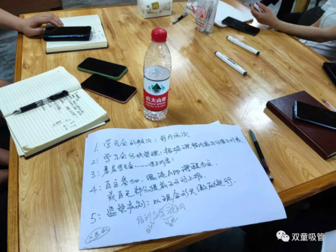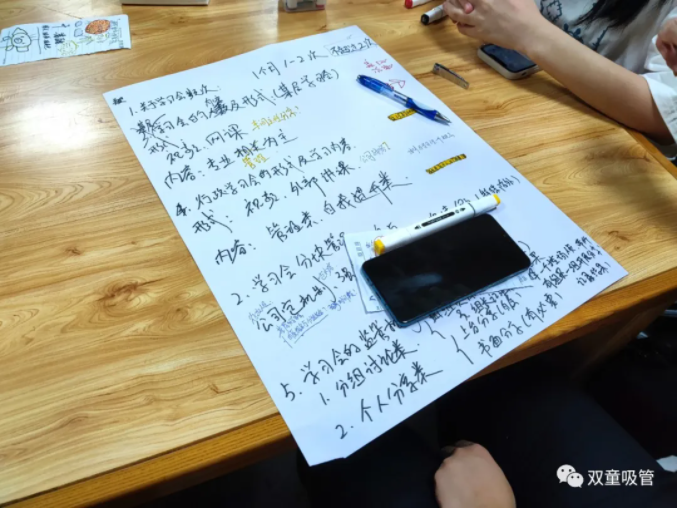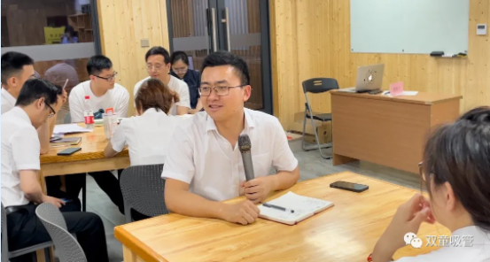 樓仲平的分享,引發(fā)了大家的共鳴和一致認(rèn)可。因此,雙童的小伙伴們針對(duì)五個(gè)提問(wèn),分組對(duì)學(xué)習(xí)會(huì)機(jī)制進(jìn)行了分析討論(自營(yíng)體長(zhǎng)組,生產(chǎn)中高層組,品管研發(fā)組,行政組,銷(xiāo)售人員組)。