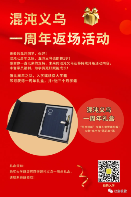 在混沌義烏即將成立一周年之際,混沌義烏也做了一個(gè)返場活動(dòng),如果大家有意向加入混沌,歡迎掃碼了解更多咨詢。