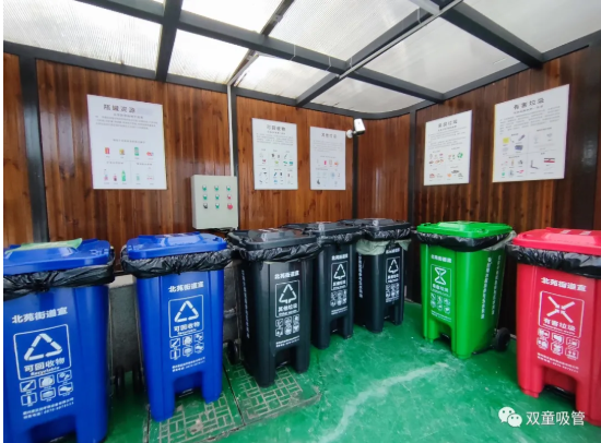 “雙童”垃圾投放房內(nèi)的垃圾箱 “雙童”的后勤人員會在每天的8:00至10:00對垃圾房進(jìn)行整理。對于其中的可回收物,清潔員會進(jìn)行二次回收和變賣,出售后的收入也將作為清潔員的獎金發(fā)放!