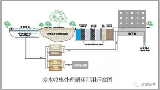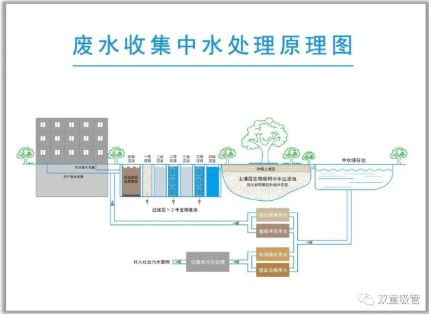 經(jīng)過處理的水可以達(dá)到了三類水的標(biāo)準(zhǔn),不能直接飲用和觸碰皮膚,但可以用于廠區(qū)綠化噴淋、所有洗手間抽水馬桶沖洗用水和道路清洗。這讓員工日常生活中所產(chǎn)生的廢水不僅得到循環(huán)利用,而且還消滅了企業(yè)的廢水排放和污染,同時一年還能為企業(yè)節(jié)省了三百多萬的費用,讓600人的工廠不用一噸自來水! “雙童”一期廠區(qū):廢水收集處理循環(huán)利用示意圖