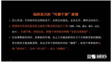 而避免“熵增”的唯一方法就是管理者持續(xù)開放和組織干預,從而打破平衡,持續(xù)加壓、刺激個體和組織喚醒“危機反饋機制”,從而讓個體和組織遠離“舒適區(qū)”,走向“學習區(qū)”,進入“恐慌區(qū)”,原有惰性才能逐漸逆轉,從而煥發(fā)出新的活力!