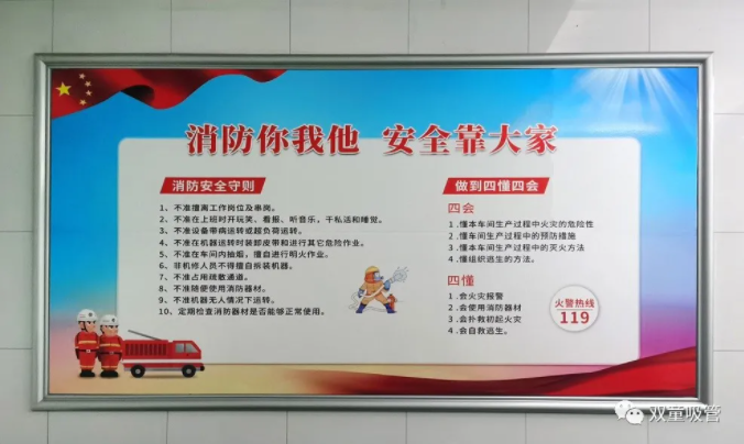 在“雙童”,各類宣傳標(biāo)識、消防器材隨處可見,安全意識深入人心!正是因?yàn)椤半p童”對安全生產(chǎn)的這份敬畏之心,才讓每一位員工心中都筑起了一道安全防線。
