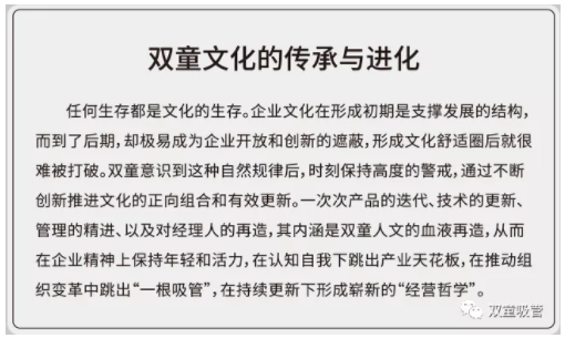 企業(yè)文化是在長期的經(jīng)營活動中形成的,是對企業(yè)成長環(huán)境、能力、經(jīng)驗的歸納與變革,伴隨著企業(yè)的歷史而生。那么“雙童”的企業(yè)文化是如何傳承和進(jìn)化的呢?