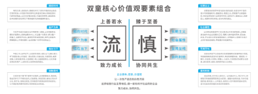 “致力成長(zhǎng),協(xié)同更生”是雙童的核心價(jià)值觀,同時(shí)兩句話可以拆分為“流”和“慎”兩個(gè)要素?!傲鳌笔侵钙髽I(yè)在高速變化的市場(chǎng)環(huán)境下,要像水一樣有序流動(dòng),保持創(chuàng)新,不斷更新發(fā)展方式。“慎”字取自易經(jīng),是小心謹(jǐn)慎的意思,指我們?cè)诓粩嘧非笪苄袠I(yè)主導(dǎo)地位的同時(shí),也一定要小心謹(jǐn)慎,“做一家有利于社會(huì)的好企業(yè)”,這句話同時(shí)也是雙童的愿景之一。
