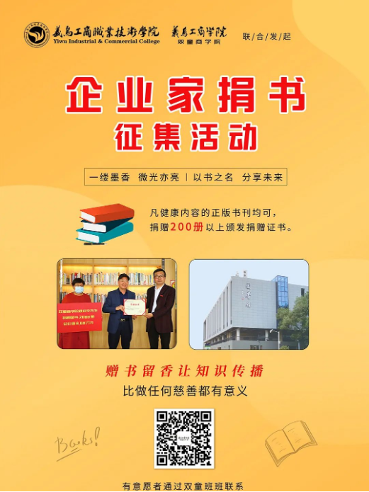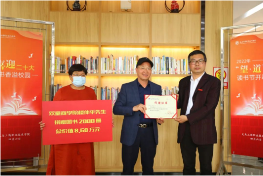 在現(xiàn)場(chǎng)圖書(shū)捐贈(zèng)活動(dòng)中,樓仲平為義烏工商學(xué)院圖書(shū)館捐贈(zèng)了價(jià)值近9萬(wàn)元的2000冊(cè)圖書(shū)。