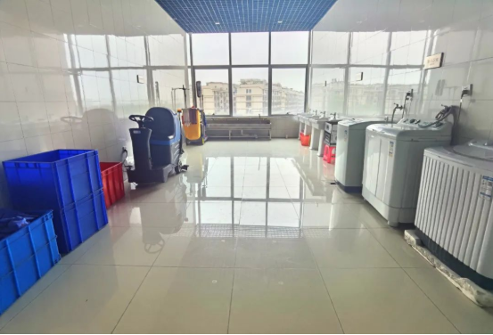 首先,是清洗場(chǎng)所。“雙童”的工服洗衣房就和車間清洗間配置在一起,既聯(lián)通車間,提高工服來(lái)回運(yùn)送的效率,又能夠保持相對(duì)獨(dú)立,不影響生產(chǎn)。這里的洗衣工具齊全,既有機(jī)洗區(qū)域,也有供斷電情況使用的手洗池。