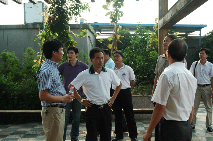 上圖:樓仲平陪同考察公司屋頂花園和循環(huán)用水情況