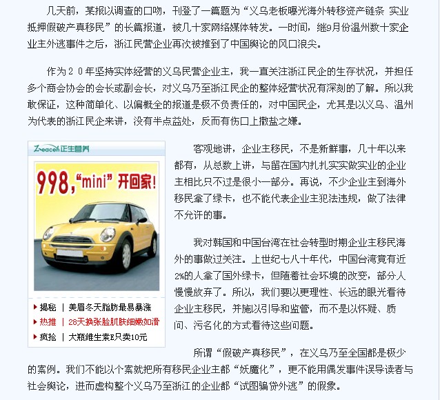 幾天前,某報(bào)以調(diào)查的口吻,刊登了一篇題為“義烏老板曝光海外轉(zhuǎn)移資產(chǎn)鏈條 實(shí)業(yè)抵押假破產(chǎn)真移民”的長篇報(bào)道,被幾十家網(wǎng)絡(luò)媒體轉(zhuǎn)發(fā)。一時間,繼9月份溫州數(shù)十家企業(yè)主外逃事件之后,浙江民營企業(yè)再次被推到了中國輿論的風(fēng)口浪尖。