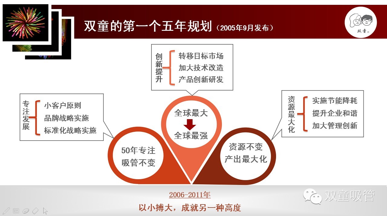 吸管是非大眾消費(fèi)的邊緣產(chǎn)品,產(chǎn)品售價(jià)低,產(chǎn)業(yè)集聚度偏低,品牌附加值偏低。一路發(fā)展,雙童經(jīng)歷了很多,也走了很多彎路。從2003年開(kāi)始,雙童逐漸放棄貪大求全的粗放經(jīng)營(yíng),重新回歸專注,只做吸管,追求產(chǎn)出最大化,抓住啞鈴兩端,明確了“五十年專注吸管不變”的發(fā)展規(guī)劃。