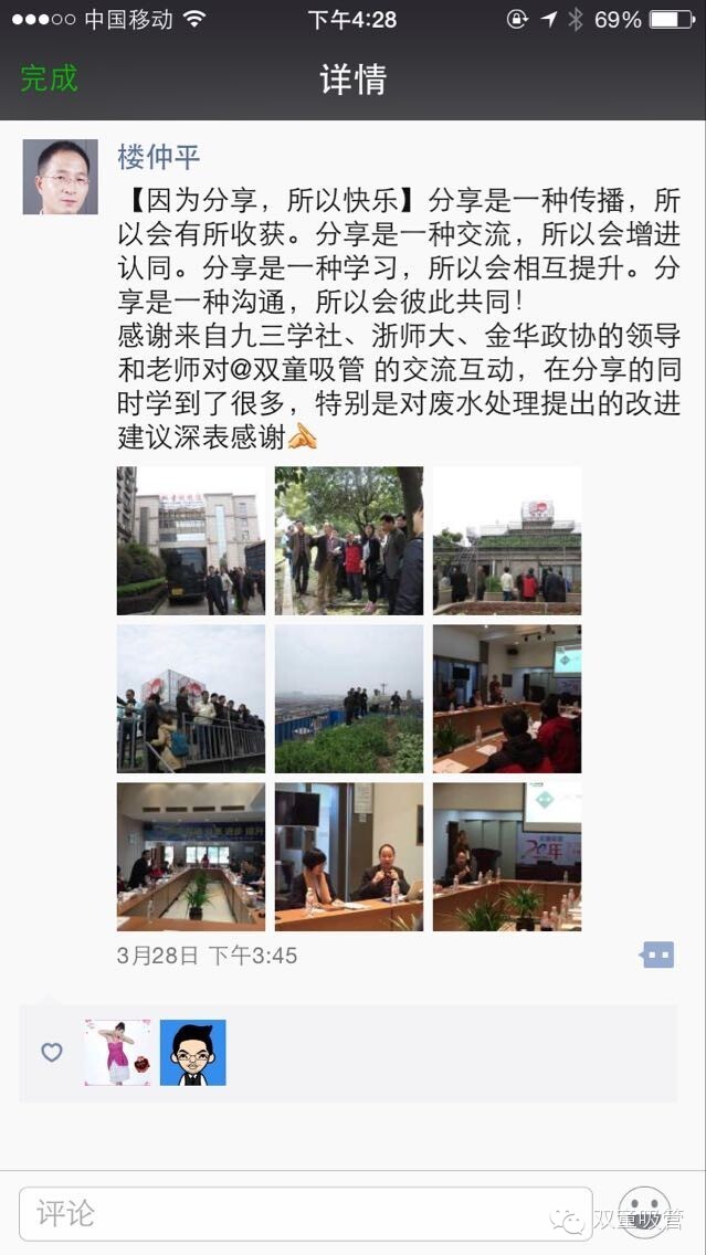 當(dāng)家人在朋友圈里發(fā)了感慨:分享是一種傳播,所以會有所收獲。分享是一種交流,所以會增進(jìn)認(rèn)同。分享是一種學(xué)習(xí),所以會相互提升。分享是一種溝通,所以會彼此共通!感謝來自九三學(xué)社、浙師大、金華政協(xié)的領(lǐng)導(dǎo)和老師對@雙童吸管 的交流互動,在分享的同時學(xué)到了很多,特別是對廢水處理提出的改進(jìn)建議深表感謝!