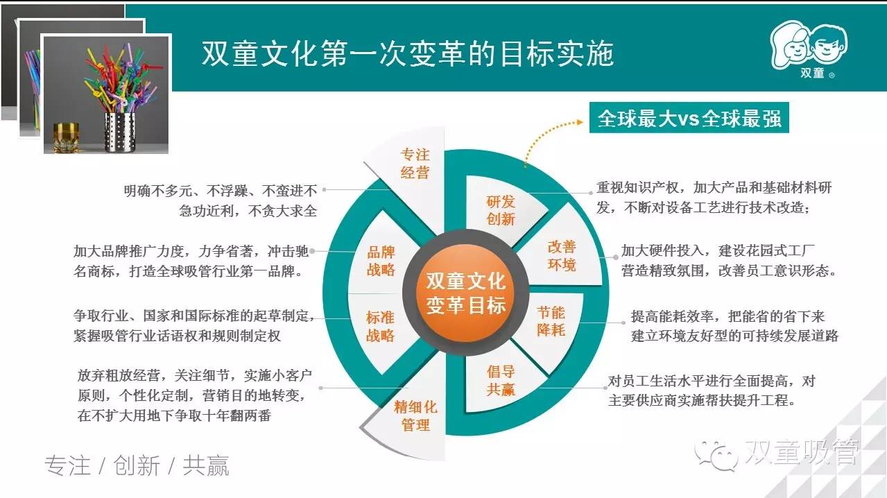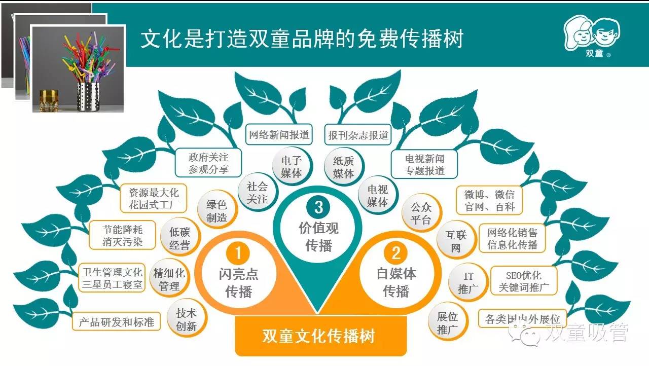 雙童的企業(yè)文化,經(jīng)過20年的積累沉淀,更經(jīng)過兩個五年發(fā)展規(guī)劃的提升,已經(jīng)成為了一個系統(tǒng)性、邏輯性的整體架構(gòu)。關(guān)于雙童的文化傳播,當家人樓總在當初制作PPT時就煞費苦心,換了好幾個表現(xiàn)形式,終于用下面這一棵“雙童文化傳播樹”的形式來展出,花費了他整整一天的時間。什么叫慢工出細活,吸管妞這回可算是真正見識到啦!