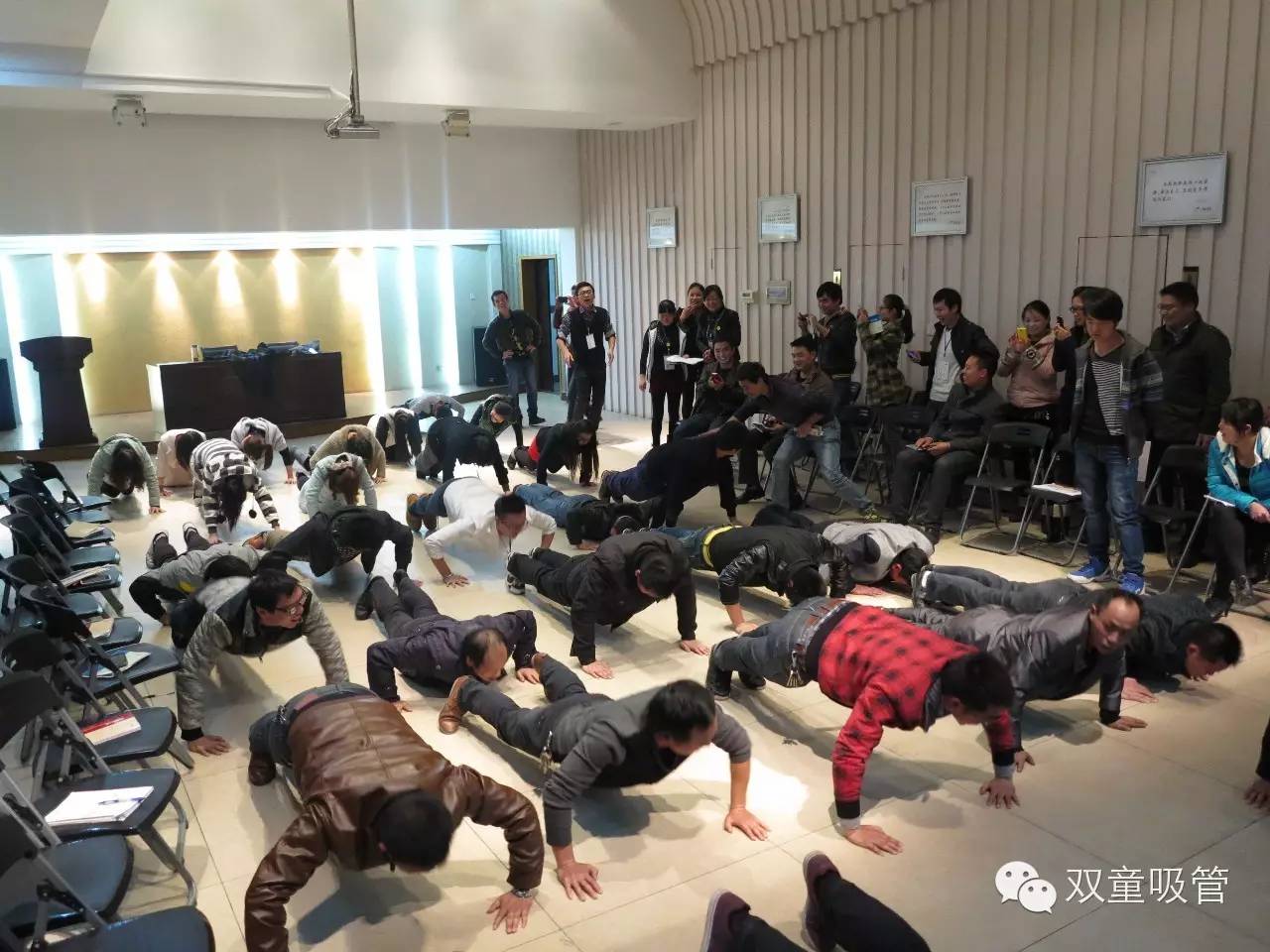 那么第二張,也是2013年的11月25日,我們的第5期學(xué)習(xí)會,我們的講師張舍姣在和大家互動游戲后,一部分同學(xué)們被“懲罰”,現(xiàn)場做了俯臥撐,這樣看是不是很壯觀呀?