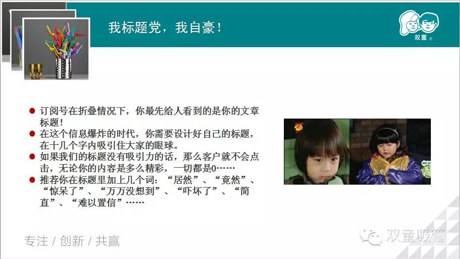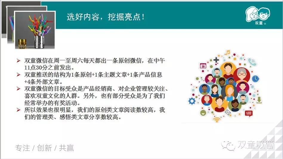 現(xiàn)如今微信發(fā)展如火如荼,用微信公眾平臺作為營銷和品牌推廣工具已是眾大企業(yè)和商家的不二之選。那么,究竟如何才能事半功倍地運營微信公眾平臺呢?不吹牛的說,吸管妞經常能聽到一些朋友對“雙童吸管”微信公眾平臺的夸贊,說這是義烏企業(yè)界運營得最好的微信公眾號。那么這次吸管妞就結合了自己在運營“雙童吸管”微信公眾號時所積累的一些經驗,把它們做成PPT分享給大家,共同分享,共同進步!