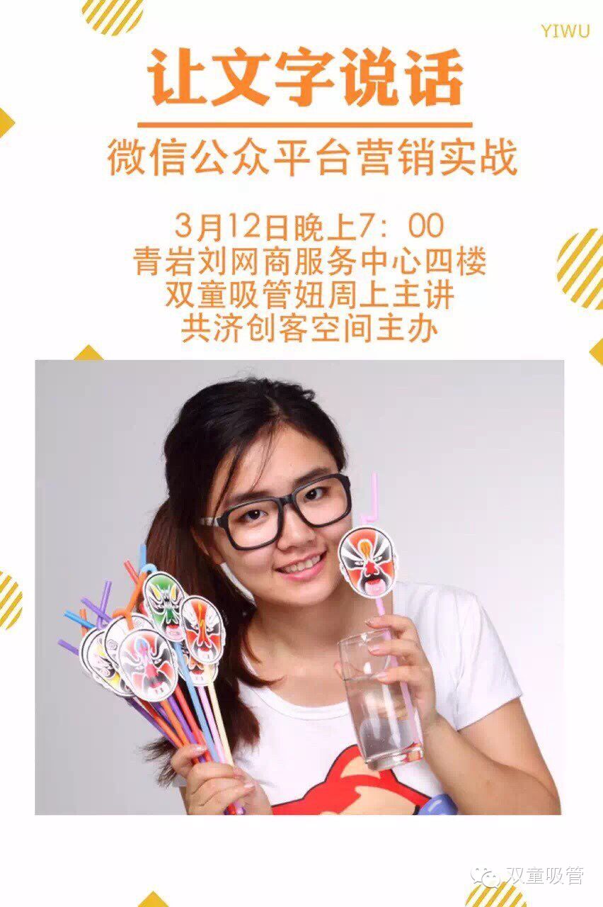 上周六晚,由共濟創(chuàng)客空間舉辦的“共濟沙龍季”在青巖劉網商服務中心四樓打響頭炮。吸管妞作為雙童吸管的文宣科主管受邀前往,向大家分享關于微信公眾賬號的維護、推廣及文章撰寫秘籍!據說,當晚共有線下100人、線上500人同時聽課呢?。≒S:幸好妞下課了才知道有這么多人,否則估計都不會說話啦!)
